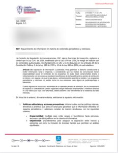 El requerimiento de la CRC es una violación flagrante al derecho fundamental a la libertad de prensa y de expresión. De un lado, contraviene la Convención Americana sobre Derecho Humanos, porque consagró que el ejercicio de la libertad de expresión no puede estar sujeto a censura previa ni se puede restringir por abuso de controles oficiales encaminados a impedir la comunicación de ideas y opiniones.