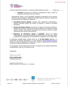 En conclusión, la solicitud -que realmente es una exigencia- a los medios de comunicación de información de políticas editoriales sobre imparcialidad, objetividad y veracidad; las medidas sobre separación de información, opinión y publicidad; o de documentos internos vigentes y procesos de decisión editorial vulneran la libertad de prensa y el secreto profesional de los periodistas, quienes tienen derecho a la reserva de sus fuentes, apuntes y archivos personales y profesionales.